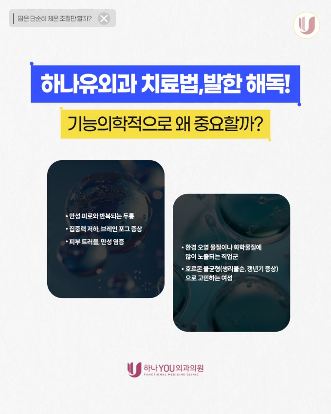 덥거나 운동을 할때 흘리는 땀을 대부분 단순한 체온 조절 기능으로 생각합니다. 하지만 기능의학적으로 발한해독 보면, 땀은 우리 몸이 스스로 불필요한 물질을 배출하는 중요한...