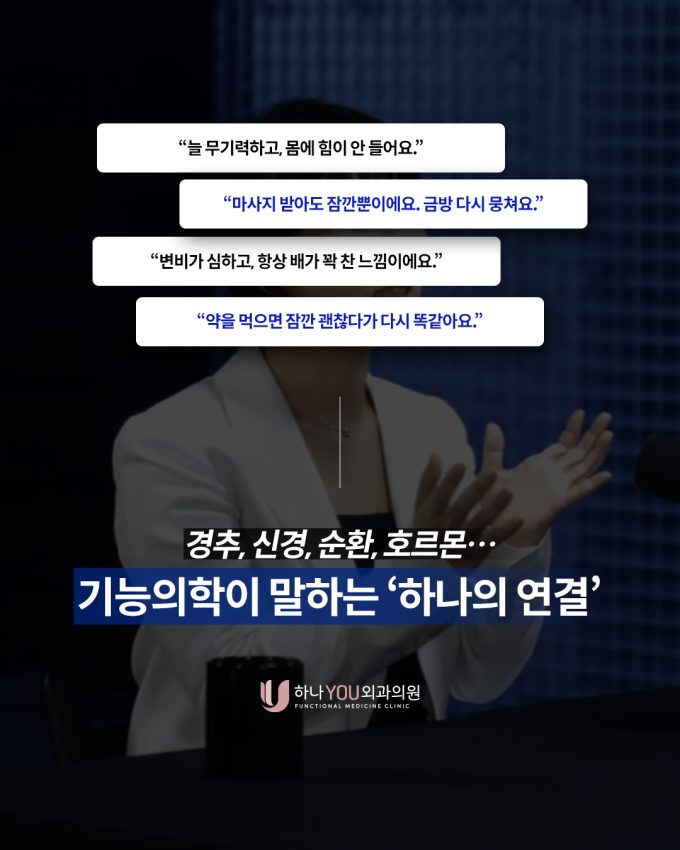 “원장님, 요즘 자꾸 목이 답답하고어깨가 뭉쳐요.눈도 시리고, 잠도 잘 안 오고요.” 이런 말을 하며 하나유외과 기능의학병원를 찾는 환자들이 많습니다. 각기 다른 증상처럼 보이지만,...