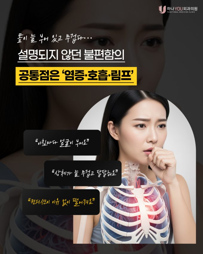 제공자 : 하나유외과 설명되지 않던 불편함의 공통점은 ‘염증/호흡/림프’입니다. 많은 분들이 “아침마다 얼굴이 부어요”, “상체가 늘 무겁고 답답해요”, “컨디션이 이유 없이 떨어져요”라고 말씀하십니다. 단순히...