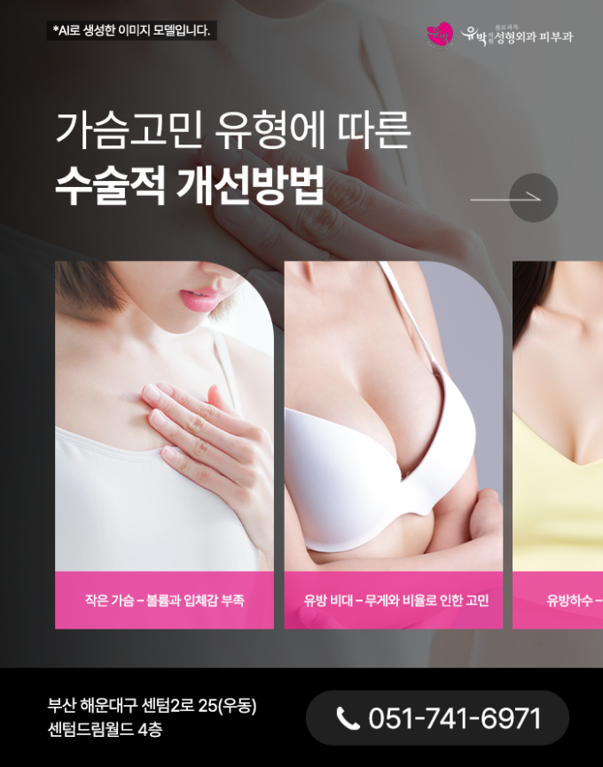 유방은 신체균형에서 중요한 역할을 하며 개인의 외형적 이미지에 큰 영향을 미치는 부위입니다. 선천적으로 가슴의 크기가 작거나 양쪽 가슴이 비대칭인 경우 혹은 출산과 수유...