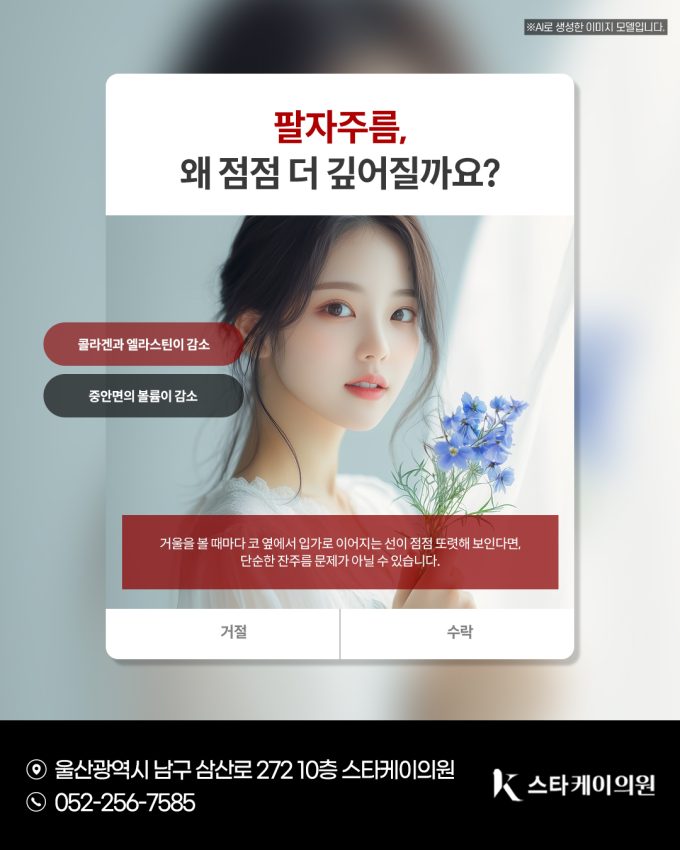 제공자 : 울산 스타케이의원 거울을 볼 때마다 코 옆에서 입가로 이어지는 선이 점점 또렷해 보인다면, 단순한 잔주름 문제가 아닐 수 있습니다. 팔자주름은 피부...