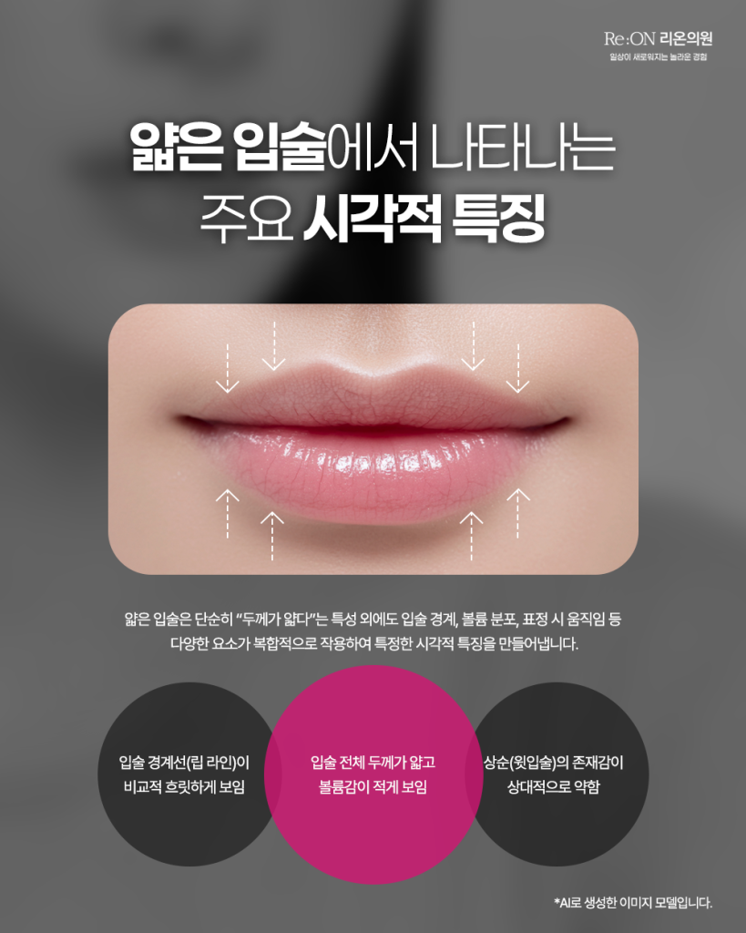 ​얇은 입술의 가장 기본적인 특징은 상순과 하순 모두에서 전반적인 두께와 돌출감이 부족하게 나타난다는 점입니다.