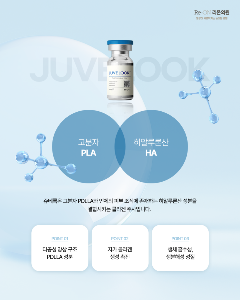 구성적으로는 생분해성 고분자인 PDLLA와 인체 피부에 자연적으로 존재하는 히알루론산이 결합된 형태로 이루어져 있습니다.