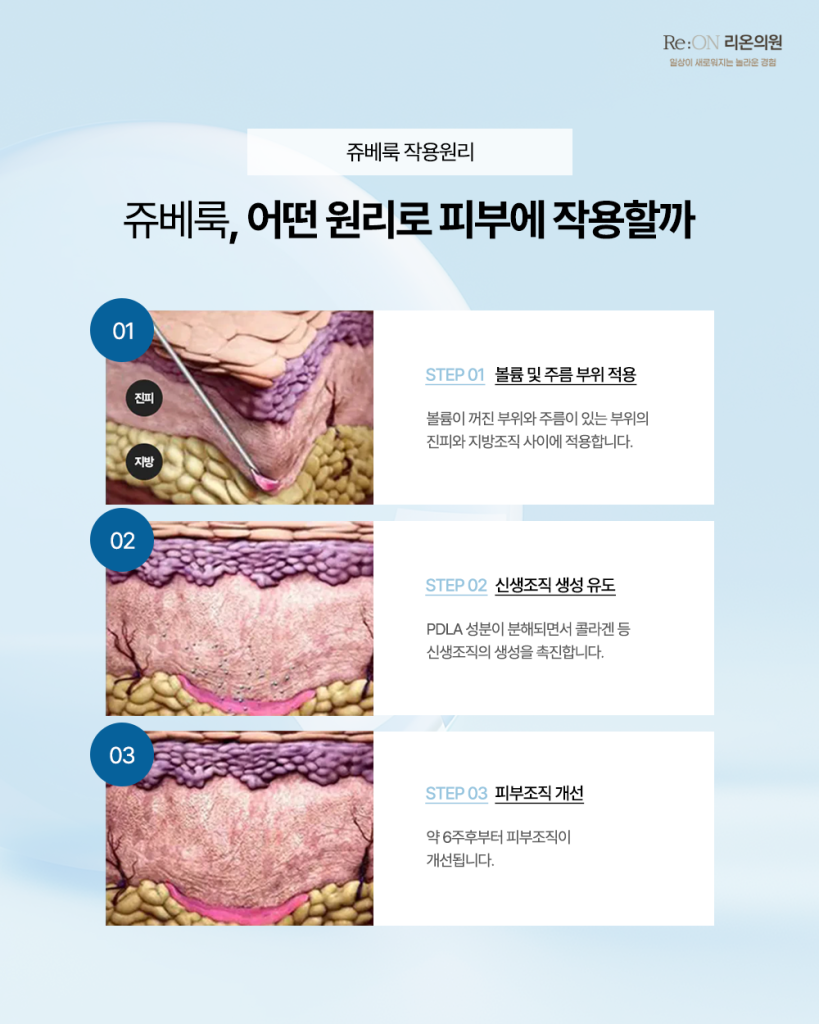 경성대쥬베룩은 피부 조직 내에서 콜라겐 생성을 유도하고 진피 구조의 개선을 목표로 하는 접근방법입니다.