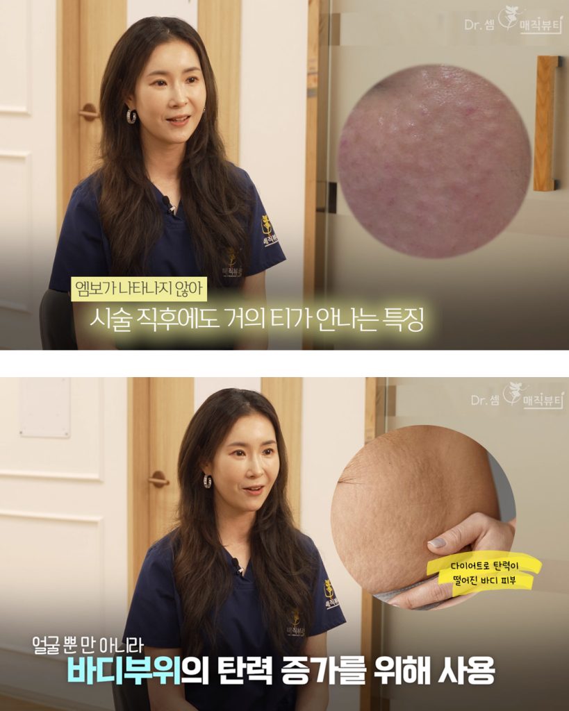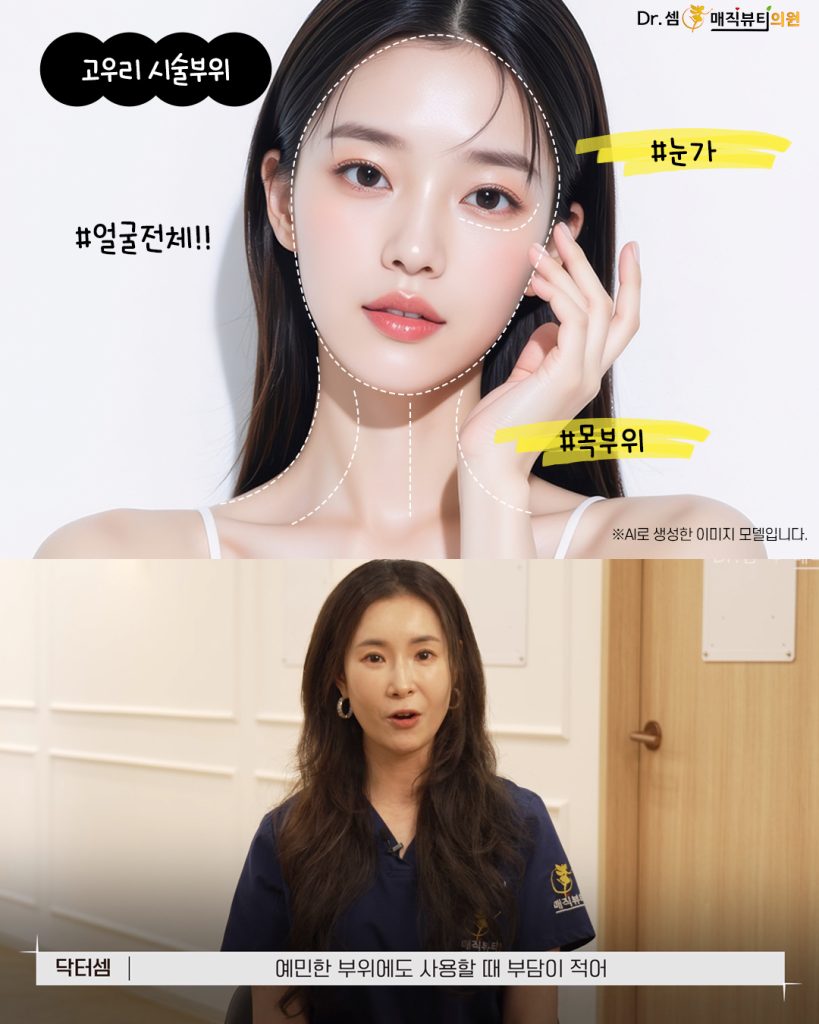 덕분에 얇은 피부에도 큰 부담 없이 사용할 수 있고 얼굴뿐 아니라 바디 까지 시술 범위를 넓힐 수 있습니다.
