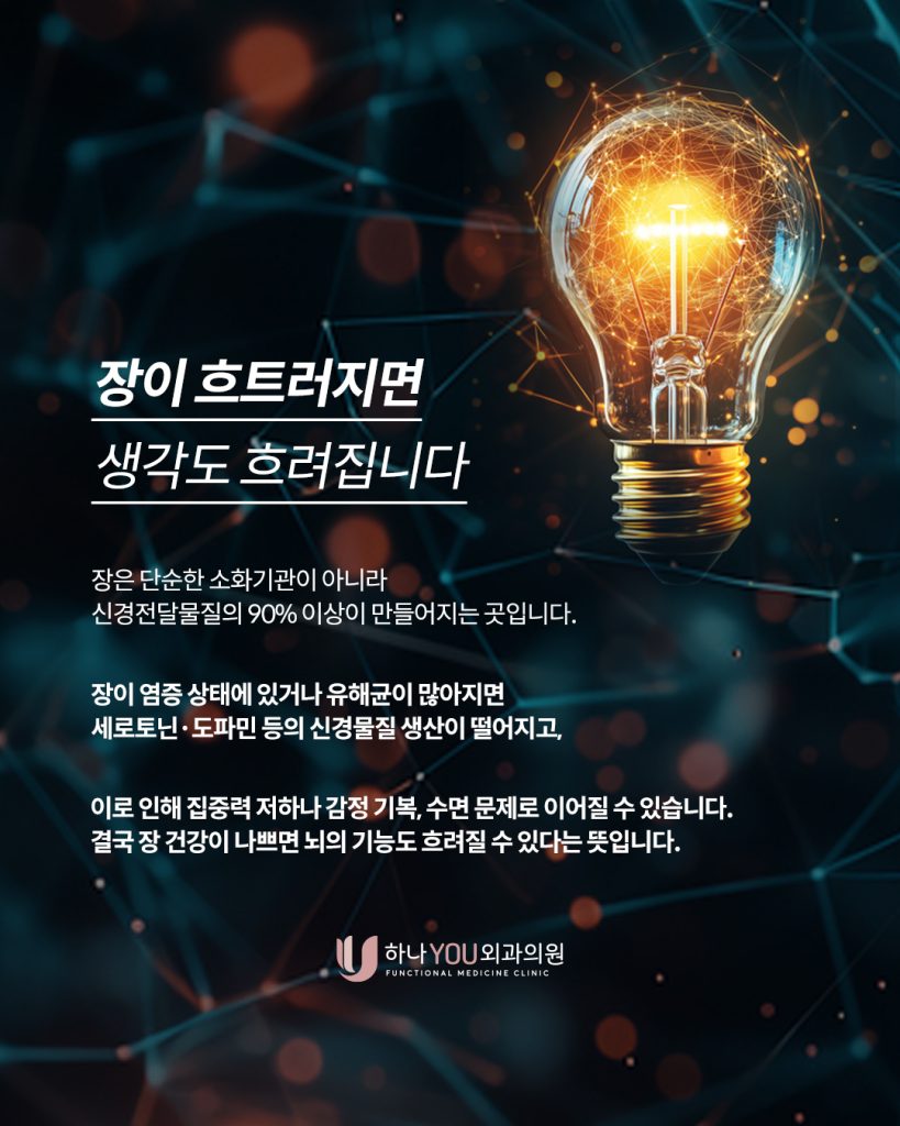 장은 단순한 소화기관이 아니라 신경전달물질의 90% 이상이 만들어지는 곳입니다. 기능의학병원 장이 염증 상태에 있거나 유해균이 많아지면 세로토닌·도파민 등의 신경물질 생산이 떨어지고, 이로 인해 집중력 저하나 감정 기복, 수면 문제로 이어질 수 있습니다.