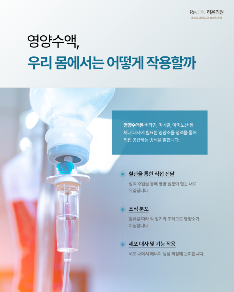 남천동영양수액은 비타민, 미네랄, 글루타치온 등 인체의 정상적인 생리기능과 에너지 대사에 필요한 영양소를 정맥을 통해 직접 공급하는 방식입니다. 일반적인 경구섭취와 달리 소화기관을 거치지 않고 혈관 내로 바로 전달된다는 특징이 있습니다.