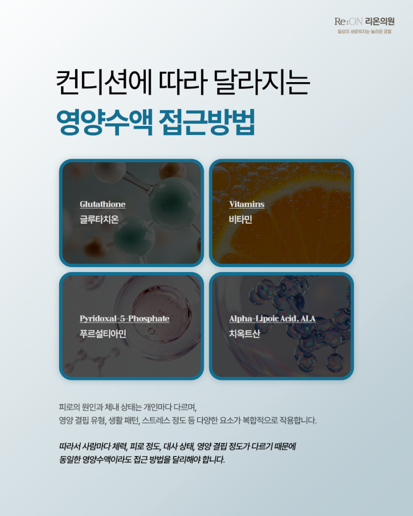 따라서 동일한 성분이라도 사람마다 체력, 피로정도, 대사상태, 영양 결핍 정도가 다르므로 전략과 접근방법은 달리 설계되어야 합니다.