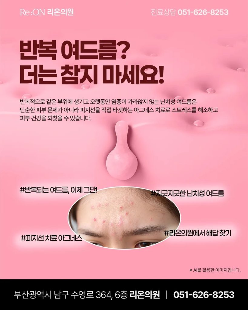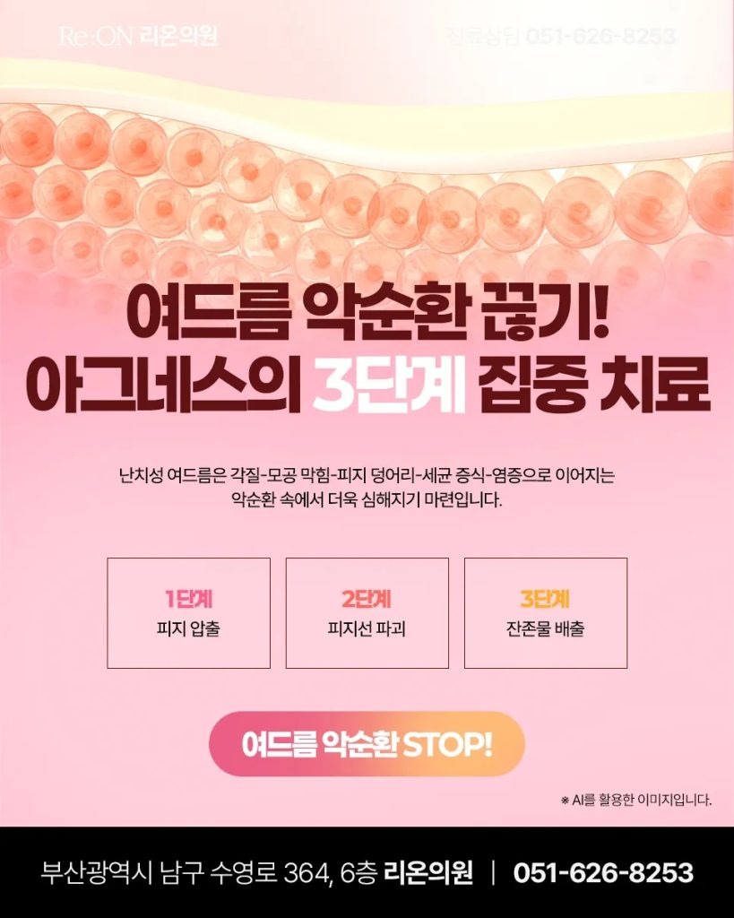 난치성 여드름은 단순히 미용적인 문제를 넘어 자신감과 삶의 질에 직접적인 영향을 주는 피부 질환입니다. 겉으로 보이는 트러블만 가리는 임시방편보다는 피부 속 원인을 제대로 치료하는 것이 필요합니다. 남천동피부과 리온의원은 숙련된 의료진과 안전성이 입증된 장비를 바탕으로 환자 개개인의 피부 상태에 맞는 맞춤형 치료를 제공합니다. 반복되는 여드름으로 고민 중이라면 정기적인 진료와 아그네스 같은 치료를 통해 피부 건강을 되찾는 것을 권장드립니다. 작은 관리의 차이가 큰 변화를 만들 수 있음을 기억하시기 바랍니다.
