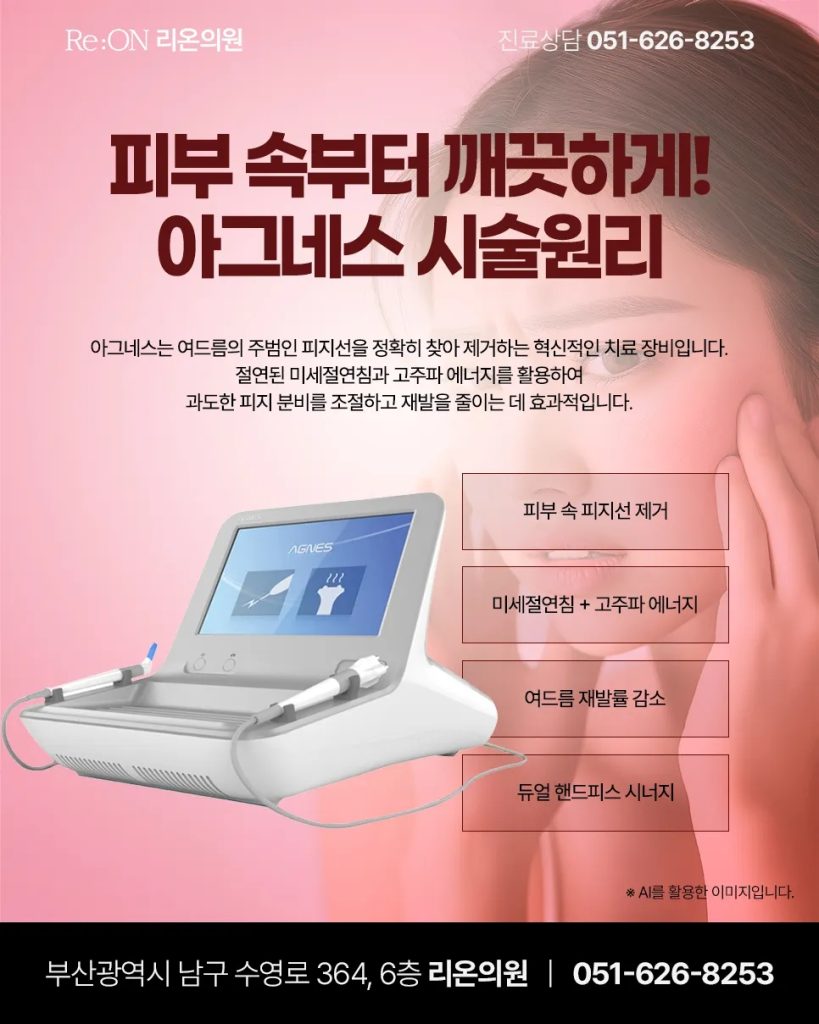 반복적으로 같은 부위에 생기고 오랫동안 염증이 가라앉지 않는 여드름은 단순한 피부 트러블을 넘어 ‘난치성 여드름’으로 분류됩니다. 이 경우 일반적인 여드름 치료만으로는 개선이 어렵고 재발을 반복하는 경우가 많아 환자들이 큰 스트레스를 받습니다. 남천동피부과 리온의원에서는 난치성 여드름의 근본 원인을 해결하는 데 초점을 맞추어 다양한 치료법을 적용하고 있으며, 그중 대표적인 장비가 바로 아그네스입니다. 아그네스는 단순히 겉에 난 여드름을 진정시키는 수준을 넘어 피부 속에서 여드름의 원인이 되는 피지선을 직접적으로 타겟하는 치료 방법입니다.