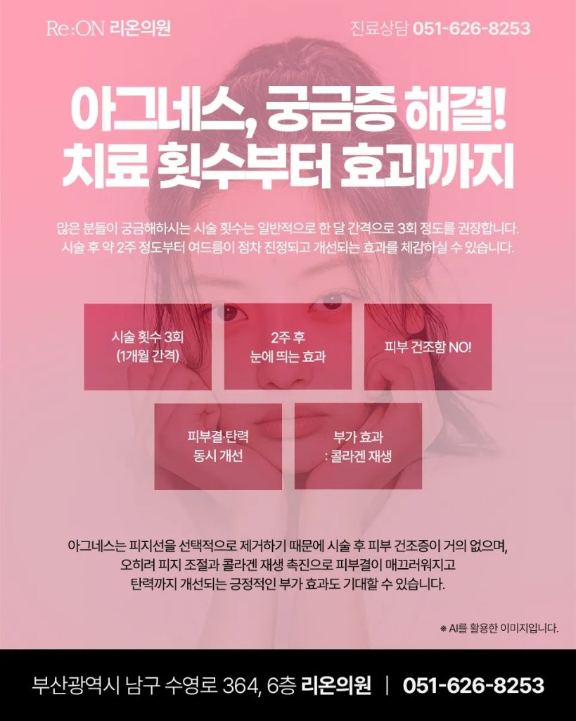 시술에 대해 환자들이 자주 궁금해하는 점들을 정리하면, 일반적으로 한 달 간격으로 3회 시술을 권장합니다. 1회만으로도 개선 효과가 나타날 수 있으나 피부 상태와 여드름 범위에 따라 추가 치료가 필요할 수 있습니다. 효과는 보통 시술 후 2주 정도부터 눈에 띄며, 여드름이 반복적으로 생기던 부위가 점차 진정되는 것을 확인할 수 있습니다. 또한 아그네스는 피지선을 일부만 선택적으로 제거하기 때문에 피부 건조증이 크게 발생하지 않습니다. 오히려 적절한 피지 조절이 이루어져 피부 결이 매끄러워지고, 콜라겐 재생이 촉진되어 피부 탄력이 개선되는 효과를 기대할 수 있습니다.