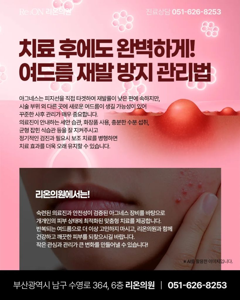 여드름 재발에 대한 우려도 많은데, 아그네스는 피지선을 직접 타겟하기 때문에 재발률이 낮은 편에 속합니다. 다만 시술 부위 외의 피지선에서는 새로운 여드름이 생길 수 있기 때문에 꾸준한 관리가 필요합니다. 따라서 시술 후 의료진이 안내하는 생활습관 관리법과 주의사항을 잘 지키는 것이 중요합니다. 예를 들어 무리한 자극을 줄이는 세안 습관, 과도한 화장품 사용 자제, 충분한 수분 섭취와 균형 잡힌 식습관 유지 등이 함께 병행될 때 치료 효과는 더욱 오래 지속됩니다. 리온의원에서는 시술 후에도 환자의 피부 상태를 주기적으로 확인하고, 필요한 경우 보조 치료를 추가해 최적의 결과를 유지하도록 돕고 있습니다.