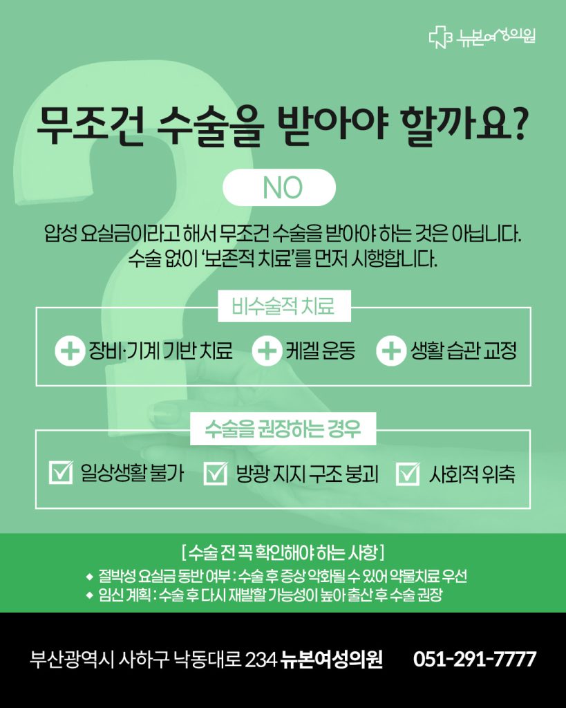 증상이 경미하면 생활습관 교정이나 골반저근육 운동 등 보존적 관리가 먼저 고려됩니다.