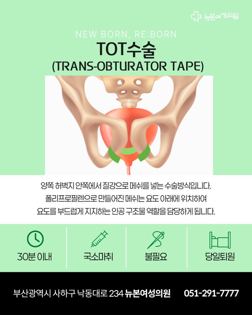 TOT수술은 국소마취로 약 30분간 진행되며, 수술 즉시 요실금이 없어져 일상생활이 가능합니다.