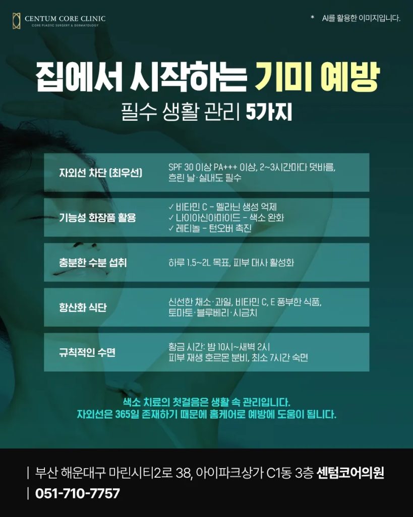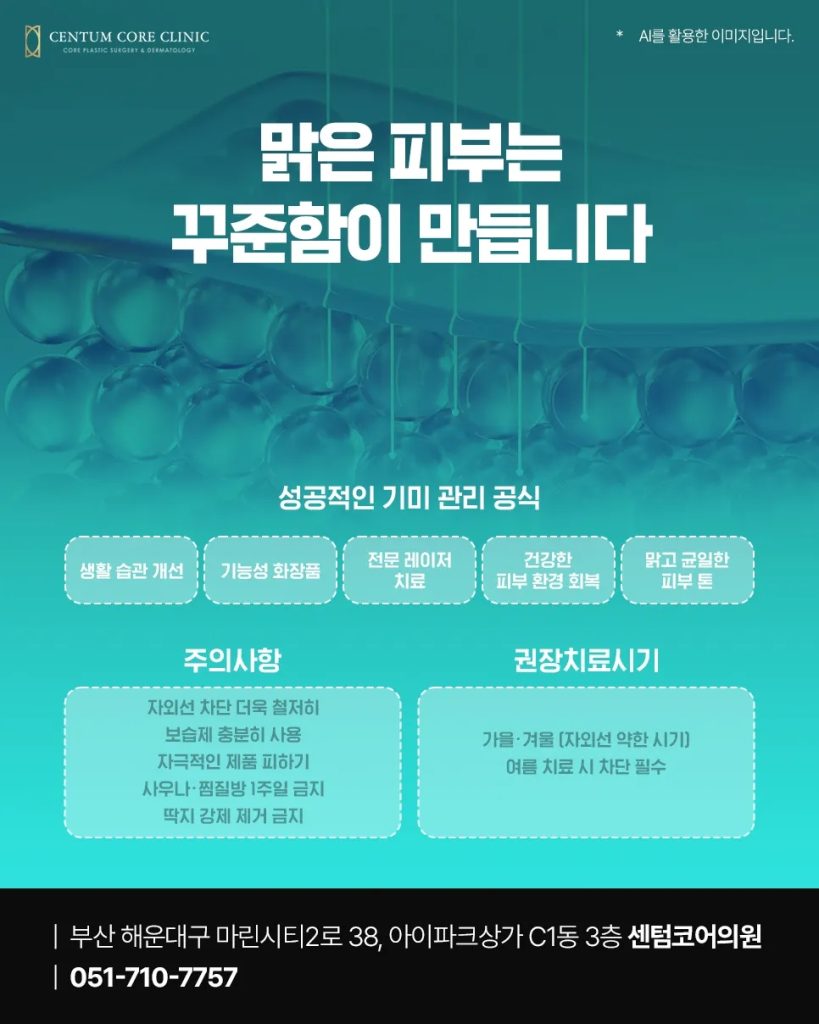 색소 관리의 핵심은 단기간에 완벽하게 없애는 것이 아니라, 장기적으로 건강한 피부 환경을 회복하는 것입니다. 생활 습관 개선, 기능성 화장품 활용, 전문 레이저 치료가 균형을 이룰 때 만족스러운 결과를 얻을 수 있습니다. 마린시티피부과 센텀코어의원은 환자의 피부 상태를 면밀히 분석하고, 개인별 맞춤 플랜을 설계해 기미·잡티는 물론 피부 전반의 건강까지 회복할 수 있도록 돕습니다.