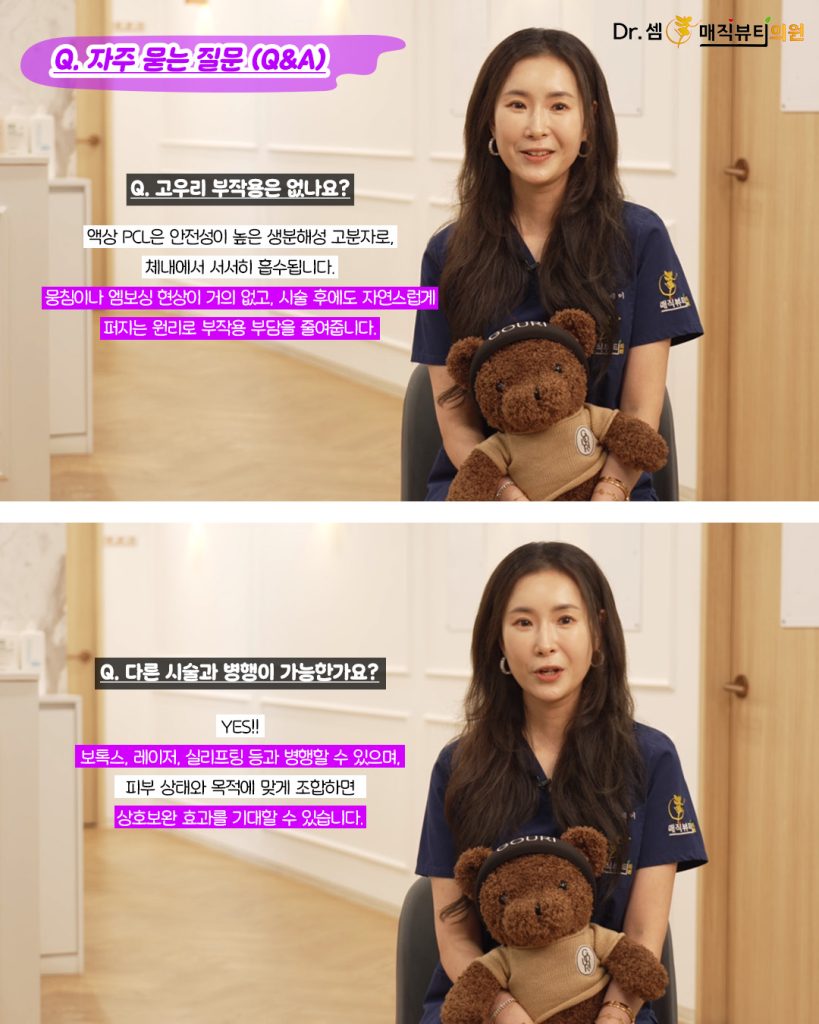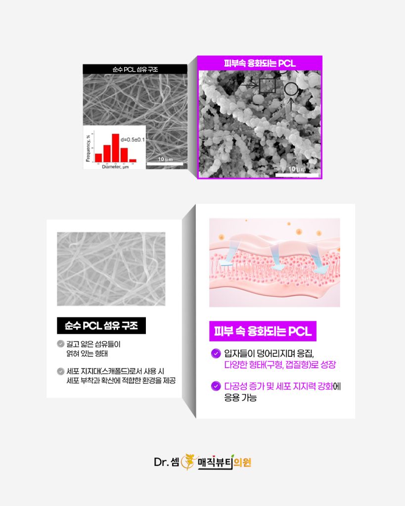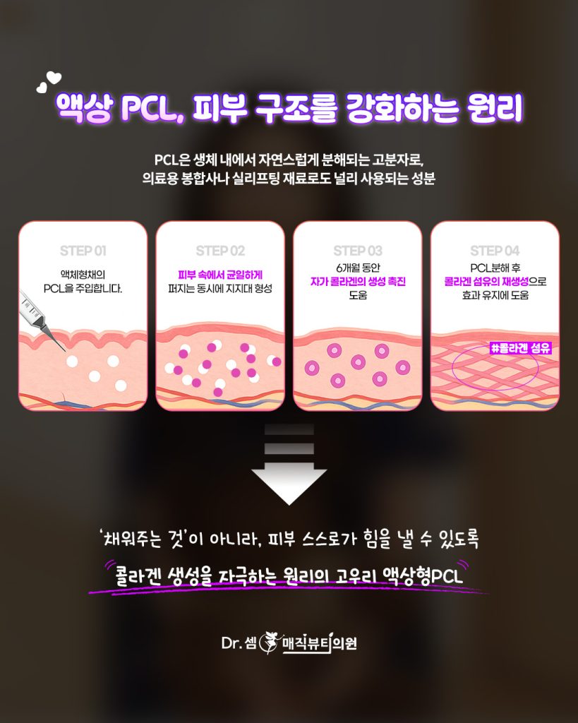 또한 PCL이 서서히 분해되면서 수개월 동안 지속적으로 자극을 주기 때문에, 단기간에만 머무는 효과가 아니라 시간이 지남에 따라 점진적으로 피부 질이 개선되는 특징을 보입니다.