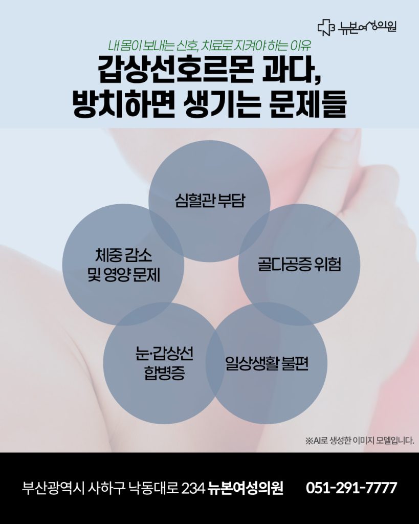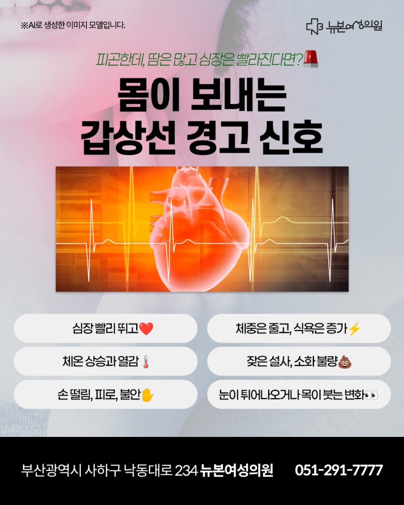 갑상선기능항진증은 초기 증상이 스트레스로 인한 변화와 비슷해 놓치기 쉬워 방치할 경우 심혈관 부담, 체중 감소와 영양 문제, 골다공증 위험, 눈과 갑상선 관련 합병증까지 이어질 수 있어, 증상이 반복된다면 부산갑상선항진증 검사를 통해 정확한 검사와 조기 점검이 필요합니다.