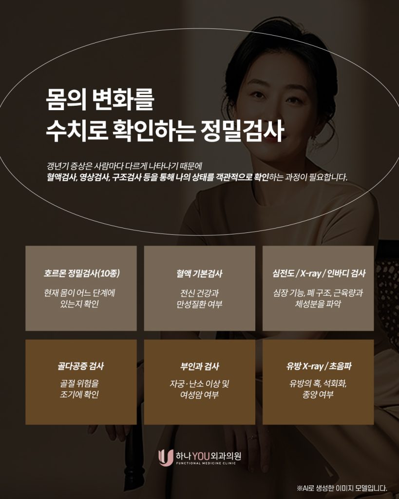 하나유외과 부산갱년기클리닉에서는 다음과 같은 정밀검사 프로그램을 통해 호르몬뿐 아니라 전신 건강까지 종합적으로 확인합니다.