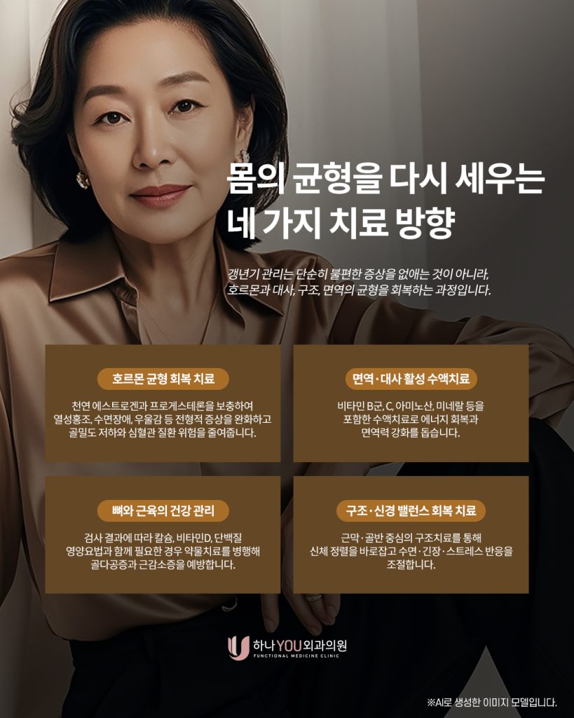 하나유외과 부산갱년기클리닉은 호르몬·면역·구조의 세 축을 통합적으로 관리하여 몸의 균형뿐 아니라 마음의 안정을 함께 돌봅니다.