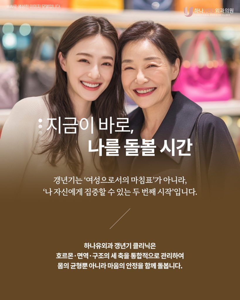 하지만 조기에 인지하고 관리하느냐에 따라 그 이후의 삶의 질은 크게 달라집니다. 하나유외과 부산갱년기클리닉은 이 시기를 몸과 마음을 다시 정비하는 전환점으로 바라보고, 여성의 건강 여정을 함께합니다.