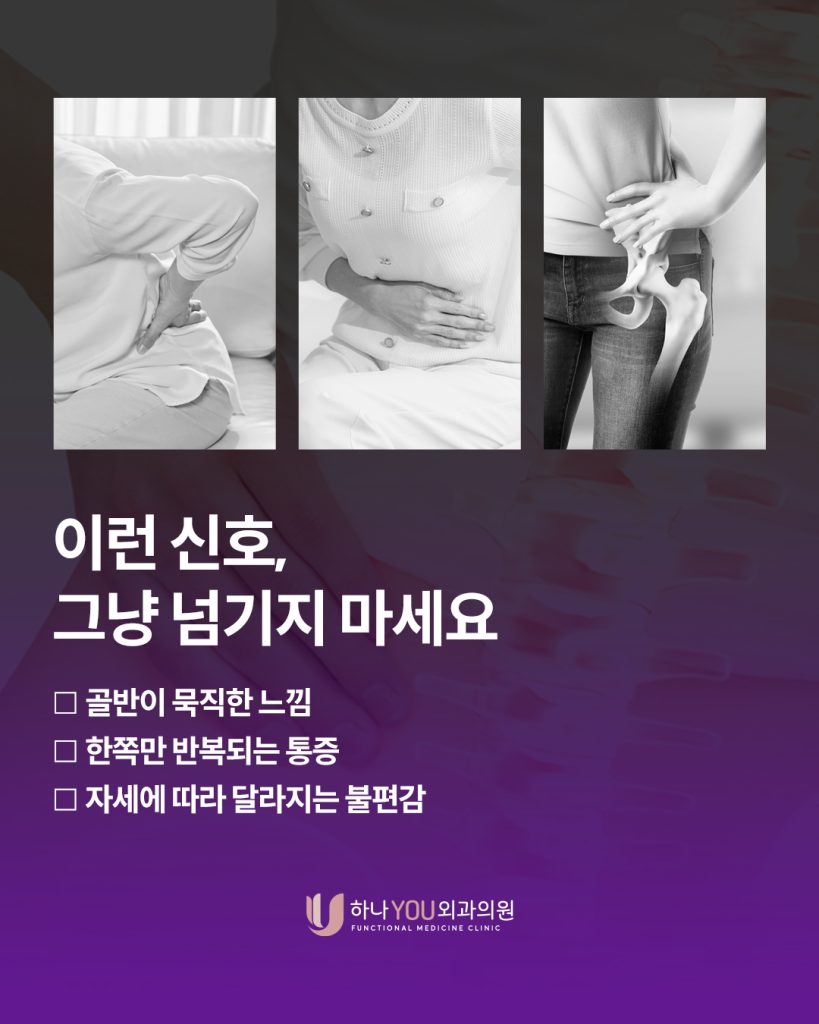 골반이 묵직한 느낌이 들거나 한쪽으로 치우친 통증이 반복되거나 자세에 따라 달라지는 불편감이 있다면 단순한 피로로 넘기기보다는 현재 몸의 상태를 한 번 확인해보시길 권해드립니다.