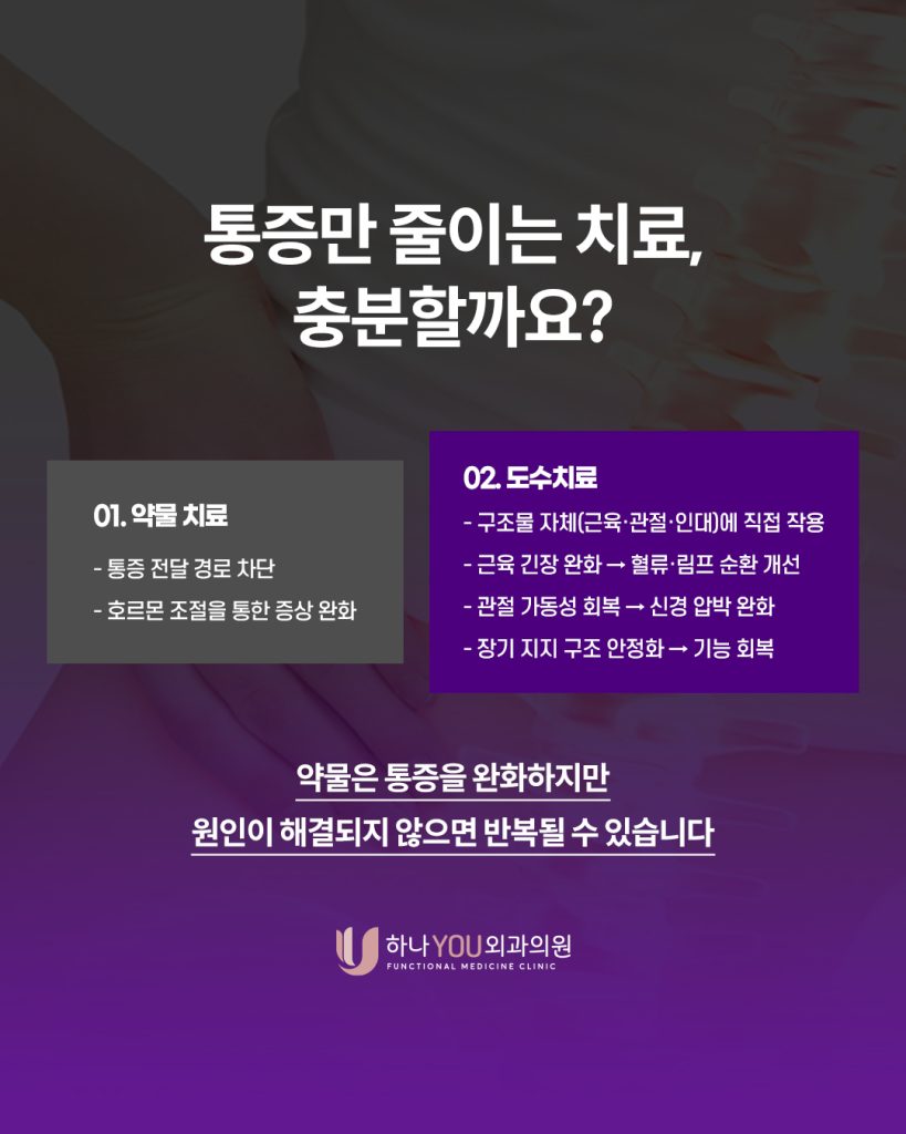 이러한 치료는 통증 완화에 도움이 되지만 골반의 구조적인 불균형까지 해결하는 것은 아닙니다. 특히 골반의 정렬이 무너지거나 근육과 인대의 균형이 깨져 있는 경우라면 이 상태가 유지되는 한 통증이 반복될 가능성이 있습니다.