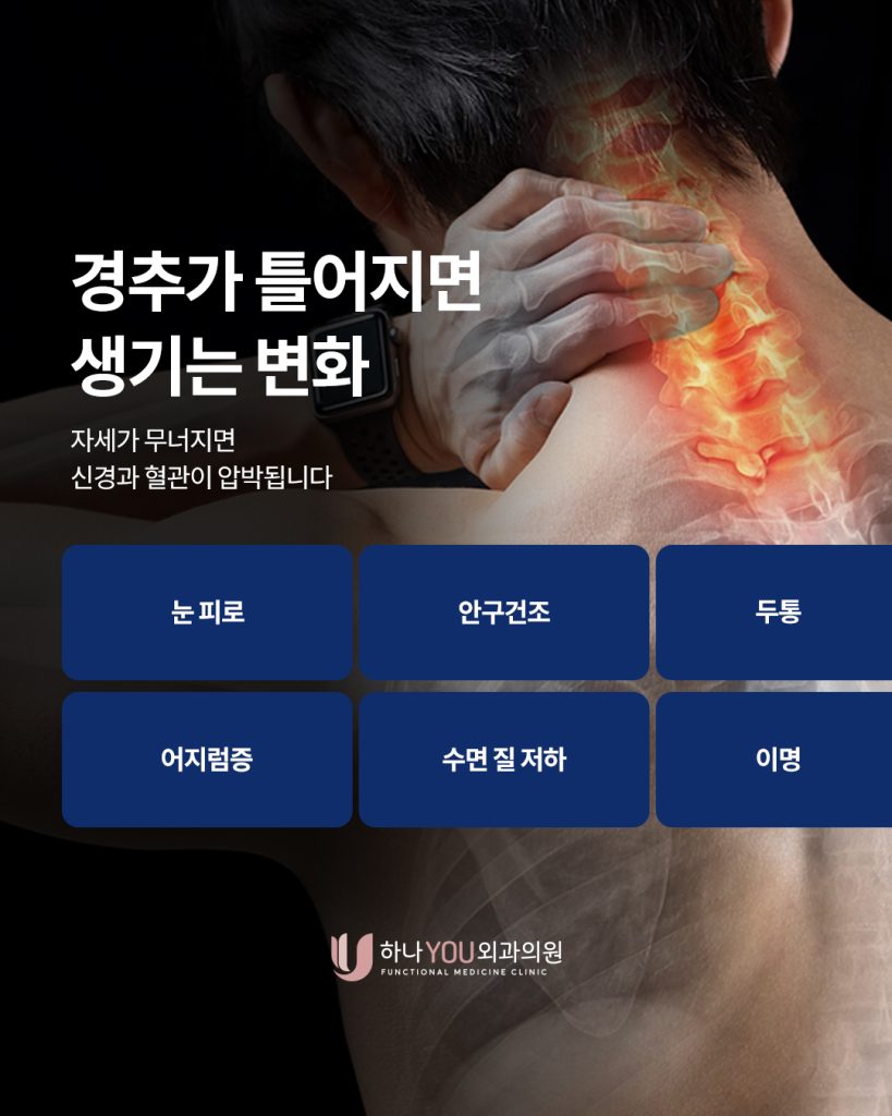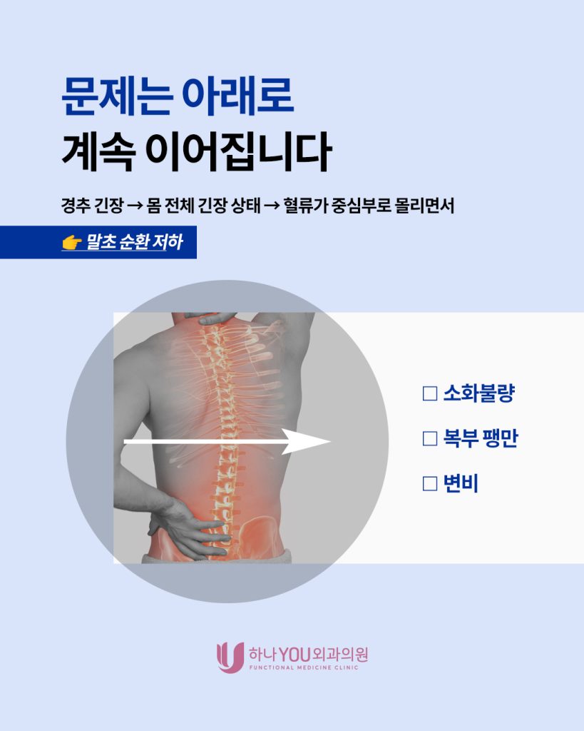 이 축이 틀어지거나 긴장 상태가 지속되면 신경 전달과 순환의 균형이 흔들리게 되고, 그 영향은 특정 부위에 국한되지 않고 전신으로 확장되는 특징을 보입니다.