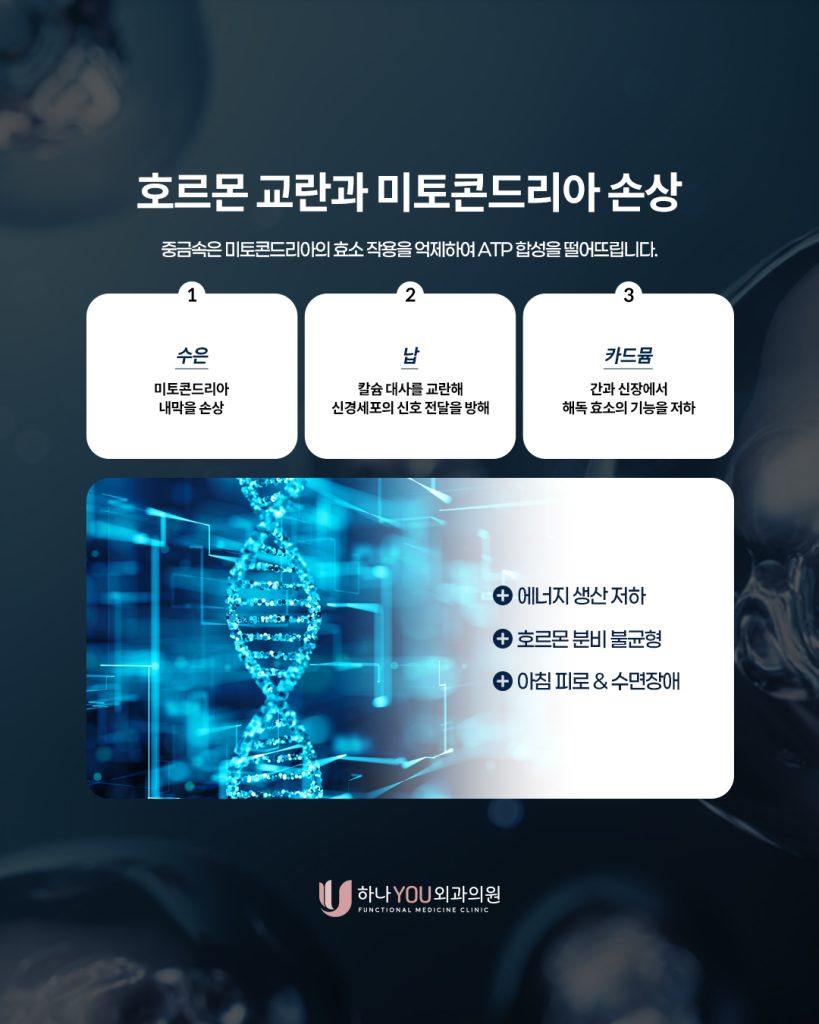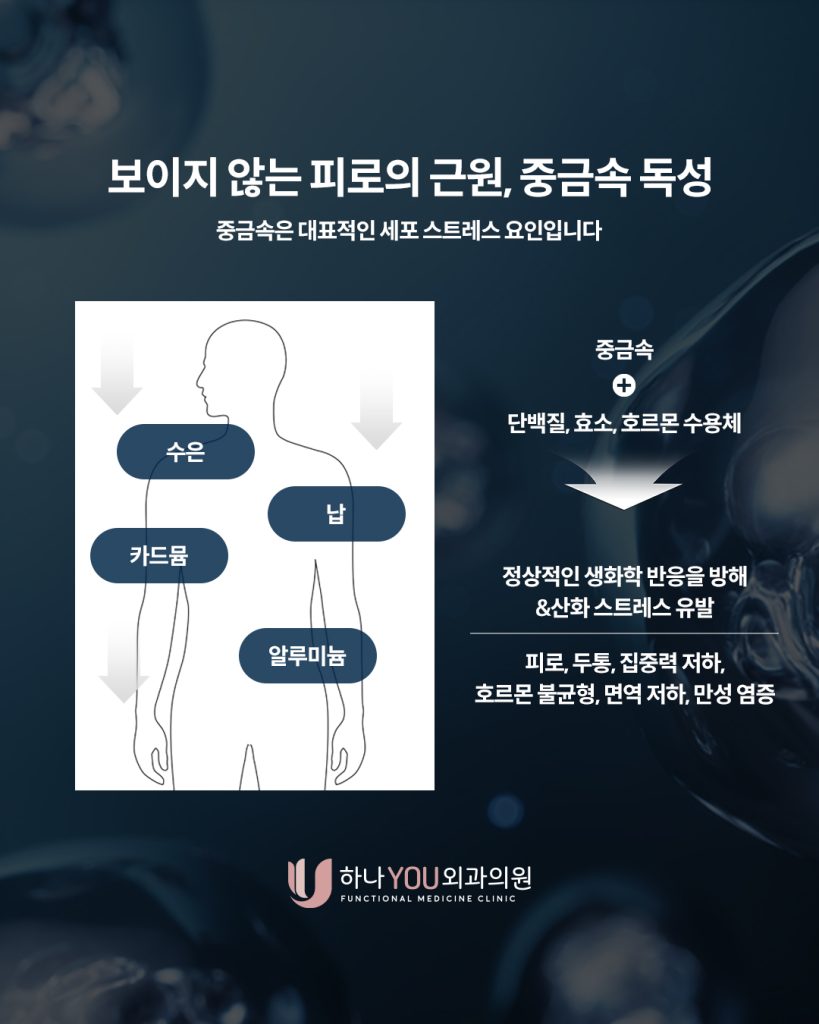 이때 가장 큰 영향을 주는 요인 중 하나가 바로 중금속 독성입니다. 우리 몸은 매일 독소를 해독하기 위해 끊임없이 일하지만, 그 부산기능의학 한계를 넘어설 때, 에너지 생산은 멈추고 피로는 쌓입니다.