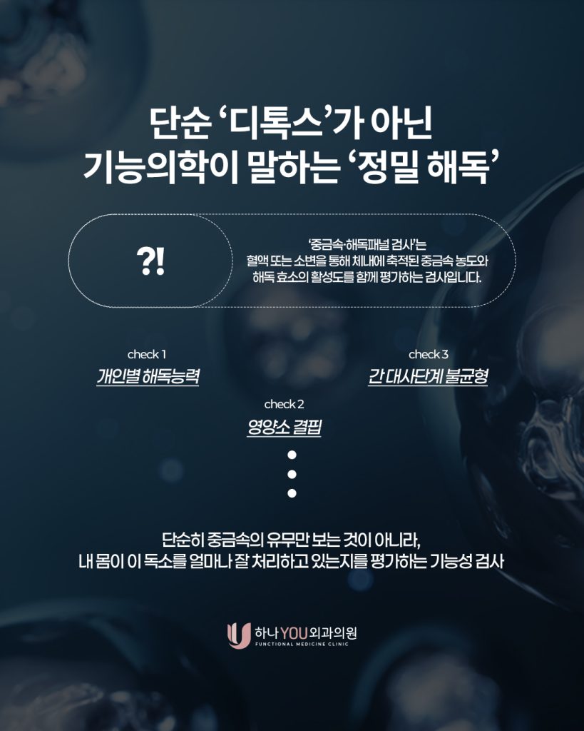 부산기능의학 하나유외과에서는 단순히 증상만을 보는 것이 아니라 그 원인을 기능의학적으로 추적합니다. ‘중금속·해독패널 검사’는 혈액 또는 소변을 통해 체내에 축적된 중금속의 농도와 해독 효소의 활성도를 함께 평가하는 검사입니다.
