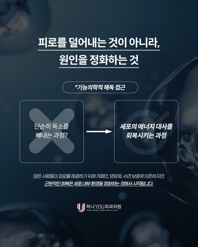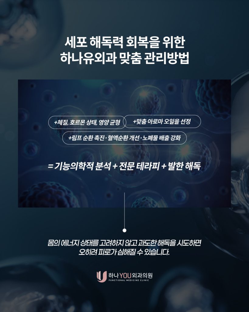 부산기능의학 하나유외과는 해독을 단순히 ‘빼는 과정’이 아니라 ‘회복시키는 과정’으로 봅니다.