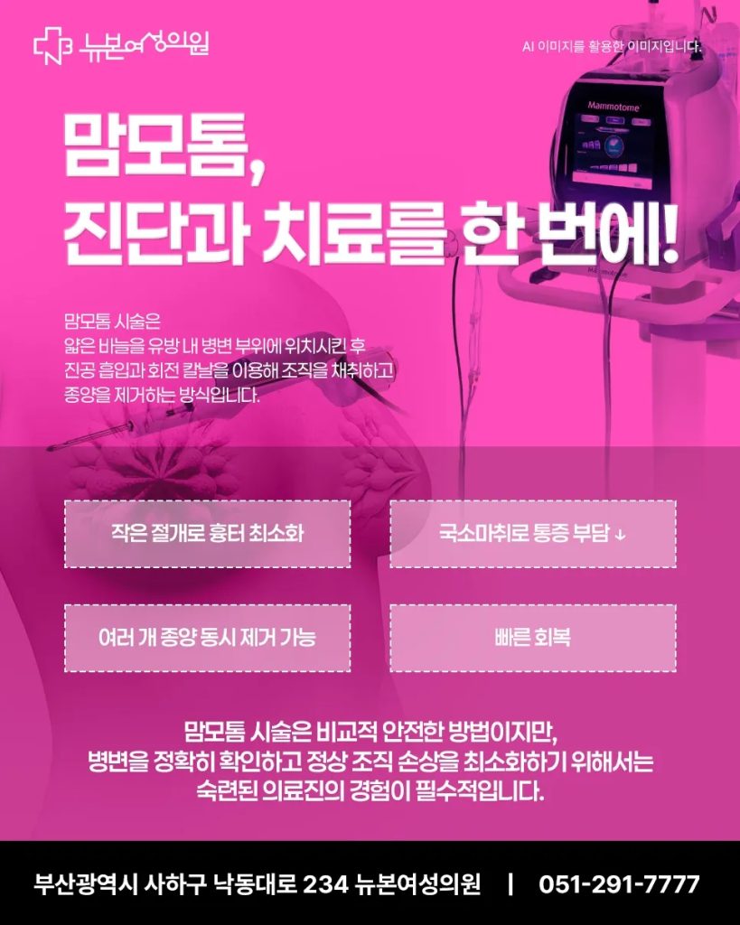 최근에는 부산맘모톰이라는 특수 시술을 통해 조직검사와 종양 제거를 동시에 진행하는 방법이 널리 사용되고 있습니다. 맘모톰 시술은 얇은 바늘을 유방 내 병변 부위에 위치시킨 후 진공 흡입과 회전 칼날을 이용해 조직을 채취하고 종양을 제거하는 방식입니다. 피부 절개가 크지 않아 흉터가 거의 남지 않으며, 국소마취 하에 시행되기 때문에 통증 부담이 적습니다. 여러 개의 종양을 동시에 제거할 수 있고 회복이 빠르다는 점에서 많은 환자들에게 선호되고 있습니다. 또한 채취된 조직은 병리검사를 통해 정밀 분석이 가능해 진단과 치료가 동시에 이뤄지는 장점이 있습니다.