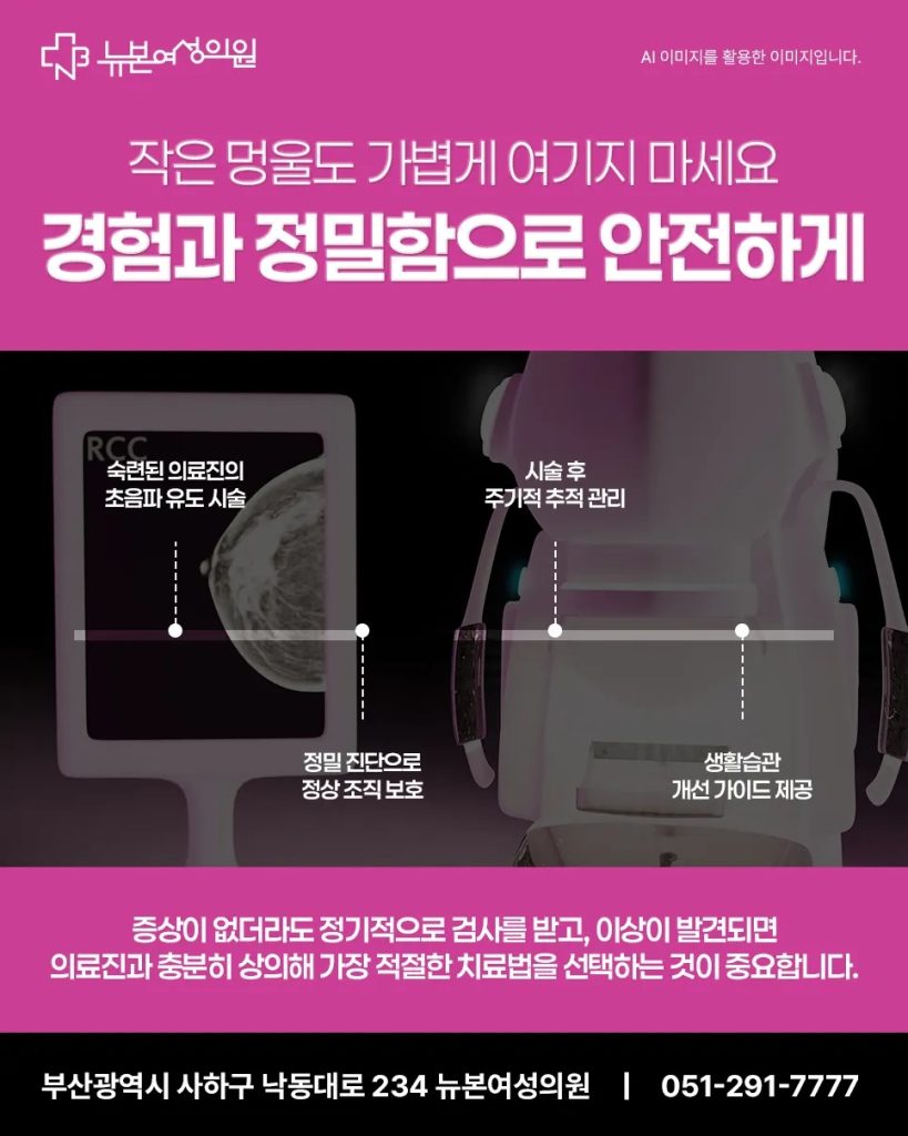 부산맘모톰 시술은 비교적 안전한 방법이지만, 병변을 정확히 확인하고 정상 조직 손상을 최소화하기 위해서는 숙련된 의료진의 경험이 필수적입니다. 뉴본여성의원은 풍부한 임상 경험을 가진 의료진이 초음파 유도 하에 정밀하게 시술을 진행해 안전성과 치료 효과를 높이고 있습니다. 또한 시술 후에도 환자 상태를 주기적으로 추적 관리하여 재발 가능성을 줄이고, 생활습관 개선까지 함께 안내해 드립니다. 정기적인 검진과 전문적인 치료는 환자의 불안을 해소하고 건강을 지키는 가장 확실한 방법입니다.