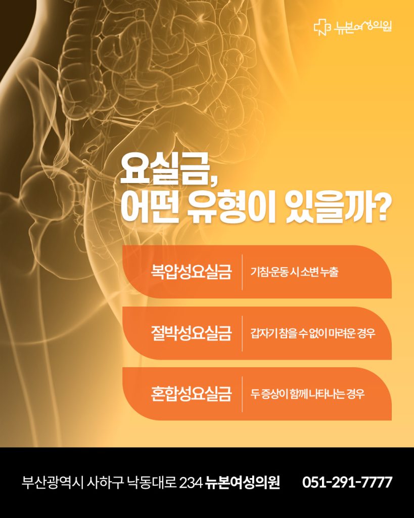 이 중 복압성 요실금이 가장 흔하며,출산 후나 중년 여성에게 자주 발생합니다.