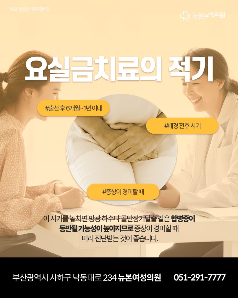 요실금은 출산 후 6개월~1년 이내,또는 폐경 전후 시기가 치료 적기입니다.