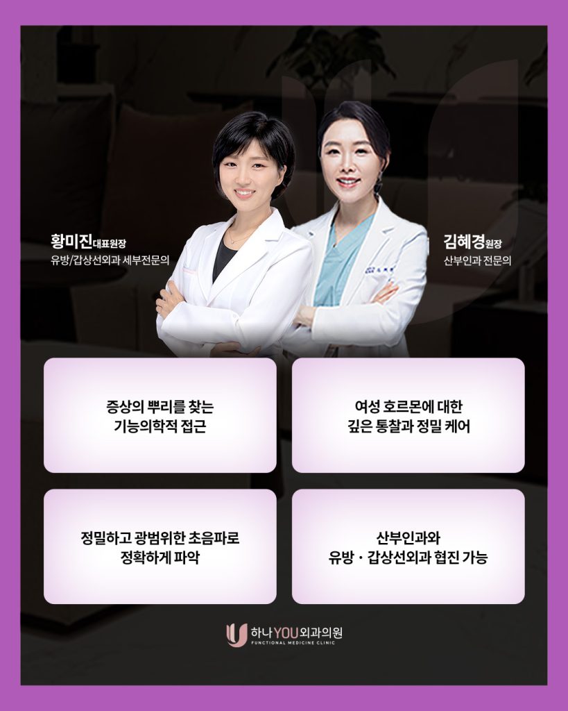 하나유외과에서는 산부인과 진료와 함께 기능의학적 관점을 고려하여 단순히 검사 결과만 확인하는 것이 아니라 호르몬 상태, 생활습관, 전반적인 건강 상태까지 살펴보며 개인에게 맞는 건강 관리 방향을 함께 고민하고 있습니다.