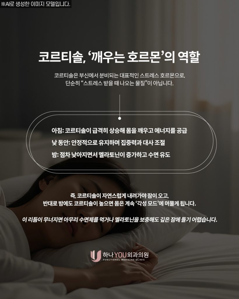 많은 분들이 이런 불면의 원인을 “멜라토닌이 부족해서”라고 생각하지만, 실제로는 수면을 방해하는 호르몬 리듬, 즉 코르티솔(cortisol)의 불균형이 핵심입니다.