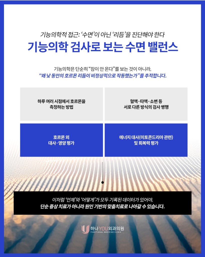 기능의학적 검사는 이 과정을 눈에 보이게 만들고, 무엇을 바꿔야 하는지 명확한 우선순위를 제공합니다. 그 결과 단순한 증상 완화가 아니라 지속 가능한 숙면과 전반적 회복력 향상으로 이어질 수도 있습니다.
