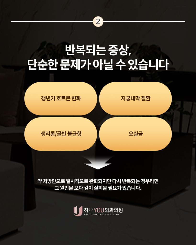 갱년기 호르몬 변화, 자궁내막 질환, 생리통이나 골반 불균형, 요실금과 같은 다양한 여성 질환은 단순히 한 가지 원인으로 발생하기보다는 복합적인 요인에 의해 나타나는 경우가 많습니다.