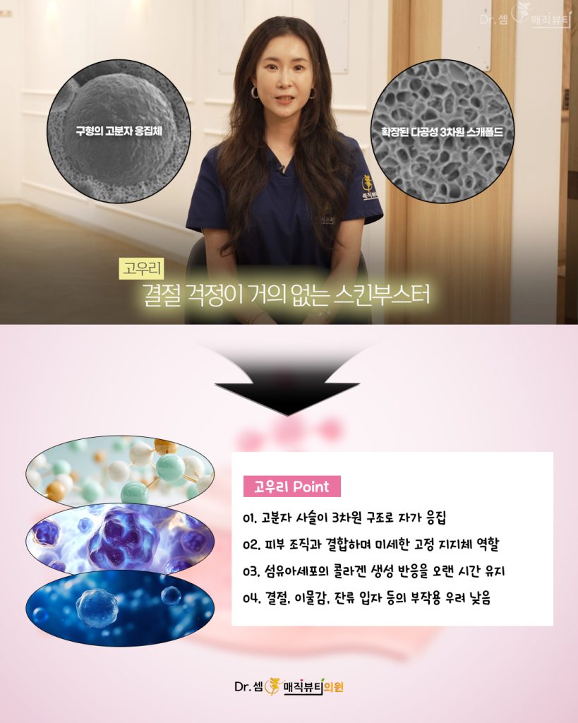 즉각적인 촉촉함은 히알루론산 성분이 담당하고 중장기적 재생 효과는 PCL이 담당하는 이중 구조가 바로 고우리 핵심 매커니즘입니다.