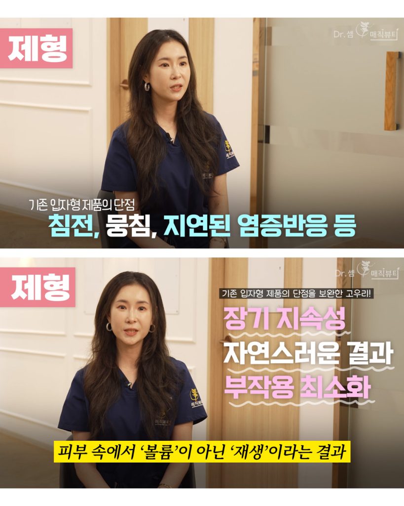 이로 인해 주입 부위에 미세한 결절이나 이물감이 나타나고, 콜라겐 생성 자극도 국소적으로 제한되는 경우가 많았습니다. 결국 환자 만족도가 일정하지 않고 시술자 숙련도에 따라 결과 편차가 크다는 한계가 있습니다.