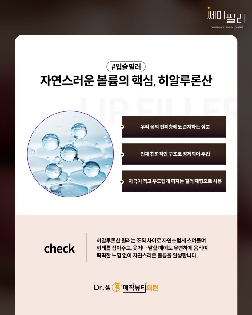 히알루론산 필러는 인체 친화적으로 정제되어 염증이나 알레르기 반응이 거의 없고, 입술처럼 움직임이 잦은 부위에서도 자연스럽게 퍼지고 부드럽게 움직입니다.