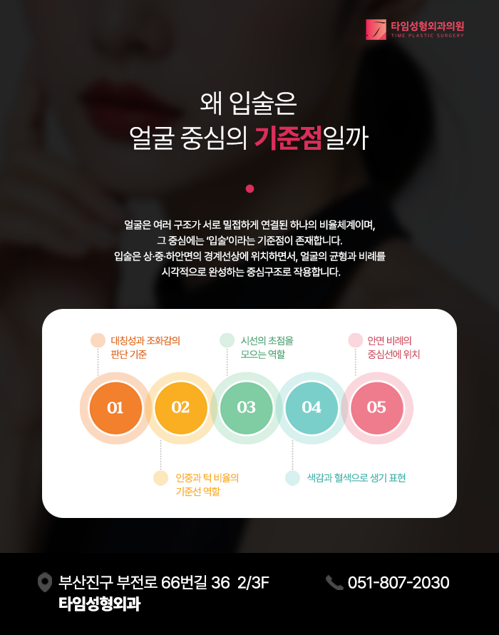 입술의 형태와 위치는 인중과 하악골의 비율을 결정짓는 기준점으로 작용하기도 합니다. 얼굴의 좌우 대칭성을 평가할때도 중간 기준선으로 작용하기도 하며 각 요소 간 조화감을 판단하는 척도로 인식되기도 합니다. 따라서 단순히 말하기, 먹기, 숨쉬기 등 뿐만이 아니라 외형적인 부분에서 안면 비례를 체계적으로 구상하는 중심점으로 유형 별 특징에 따라 얼굴에 큰 시각적 영향을 미치기도 합니다.