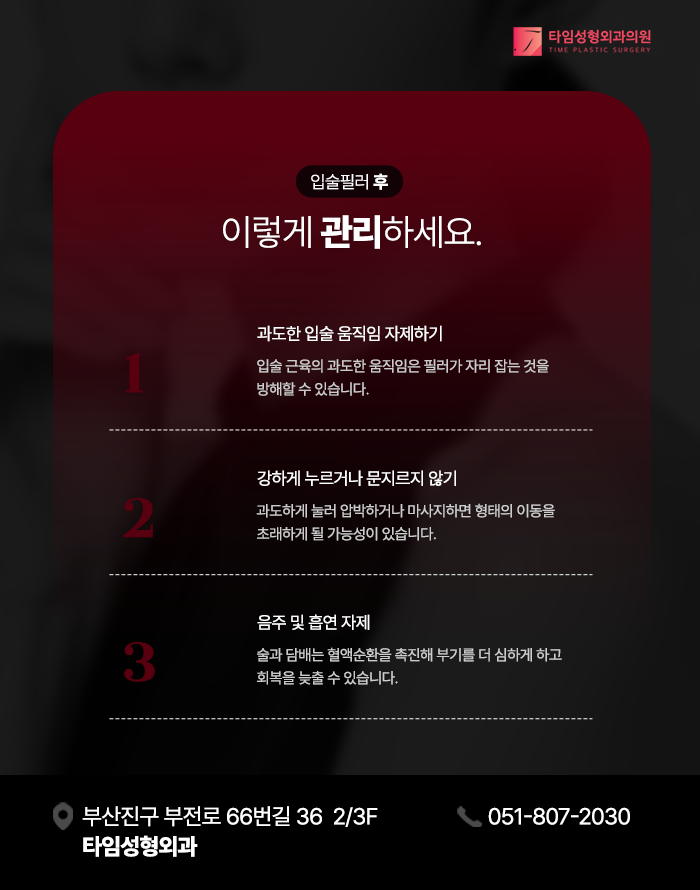 시술 직후 입술 근육을 과도하게 움직이는 행동은 피하셔야 합니다. 반복적 수축은 필러가 자리잡는 과정을 방해하여, 형태 이동이나 비대칭 발생 가능성을 높입니다. 또한 시술 부위를 강하게 압박하거나 문지르는 행위는 조직 손상과 부정형을 초래할 수 있음으로 주의가 필요합니다.