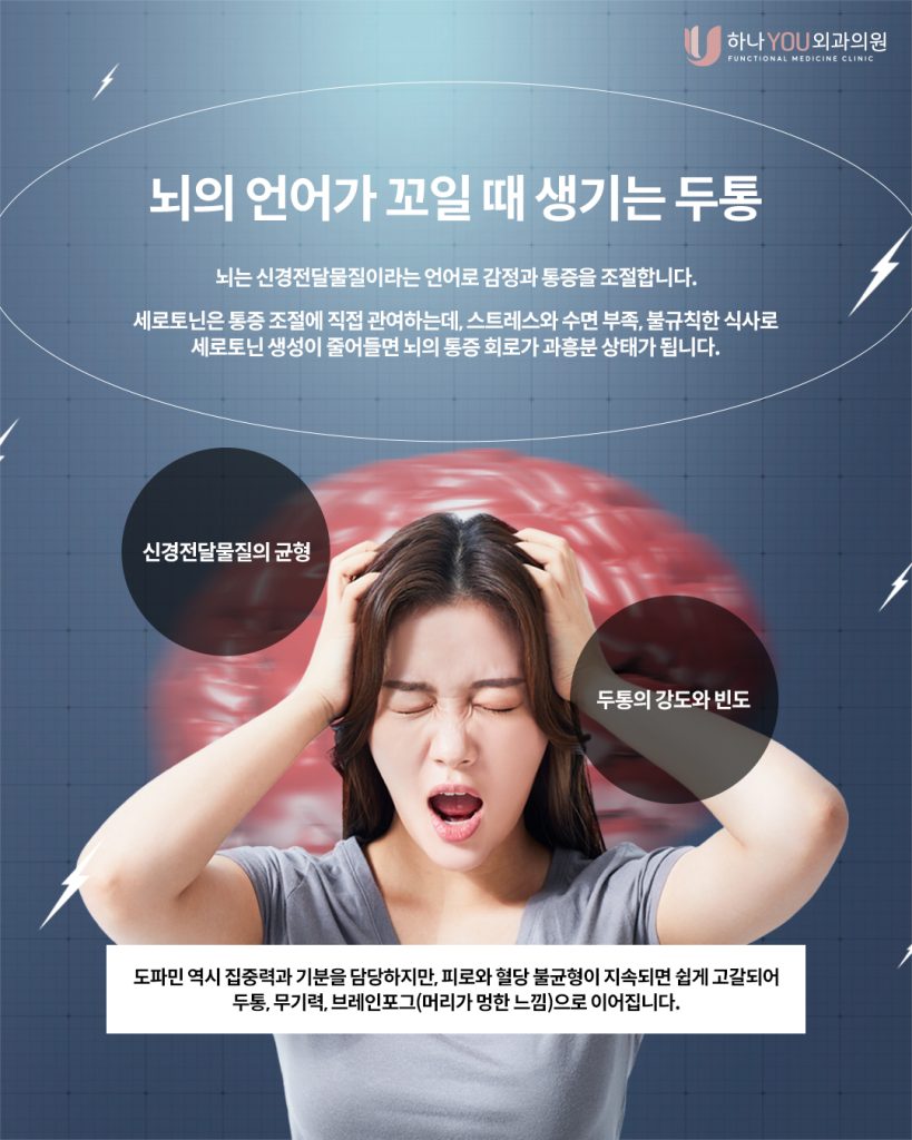 이처럼 신경전달물질의 균형은 두통의 강도와 빈도에 직접적인 영향을 줍니다.