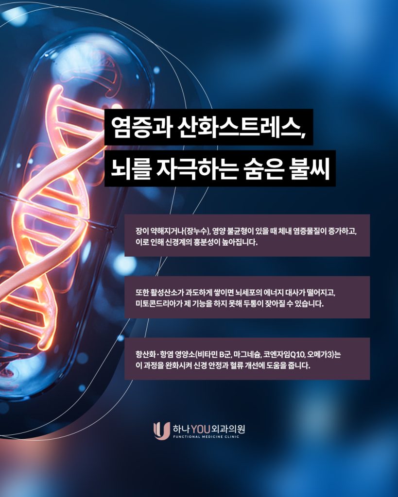 우리의 뇌는 신경계·호르몬·혈당·염증 반응이 정교하게 맞물려 작동합니다. 이 중 한 축이라도 흔들리면 신경계의 긴장도가 높아지고, 작은 자극에도 통증을 느끼기 쉬운 상태로 변합니다.