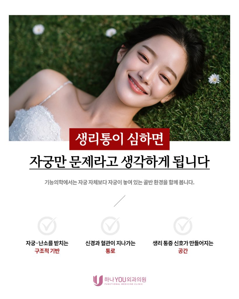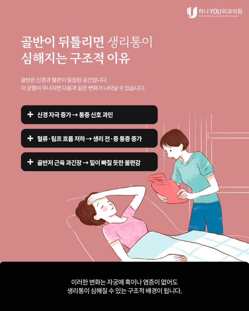 다만 자궁과 난소에 뚜렷한 문제가 없는데도 통증이 반복된다면, 그 장기를 받치고 있는 골반의 균형을 함께 점검하는 것이 필요하다고 봅니다.