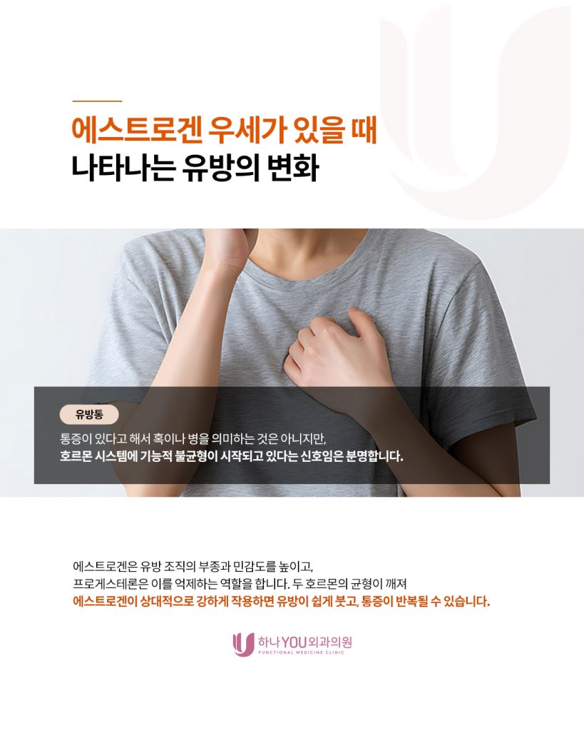 생리 주기가 다가오면 유방이 민감해지고, 묵직하거나 땡기는 통증을 경험하는 분들이 많습니다. 가벼운 불편감으로 지나갈 때도 있지만, 매달 반복되거나 강도가 점점 커진다면 단순한 PMS로만 보기는 어렵습니다. 하나유외과에서는 생리 전 유방통을 “몸의 기능적 불균형을 알리는 신호”로 해석합니다.