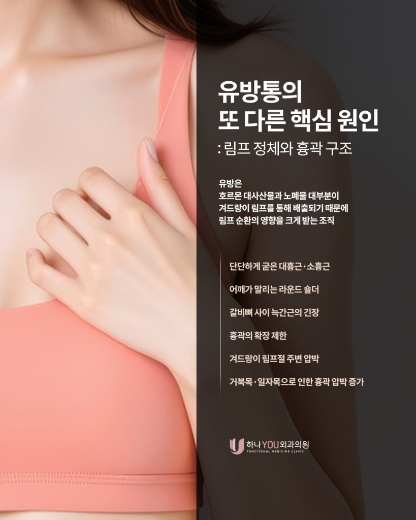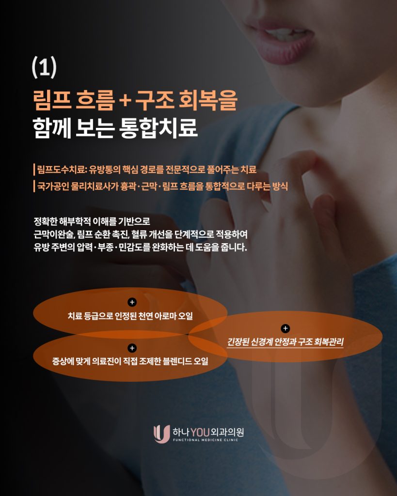 하나유외과는 호르몬–림프–구조를 하나의 시스템으로 보는 통합적 접근을 통해 유방통의 근본적인 관리 방향을 제시합니다.