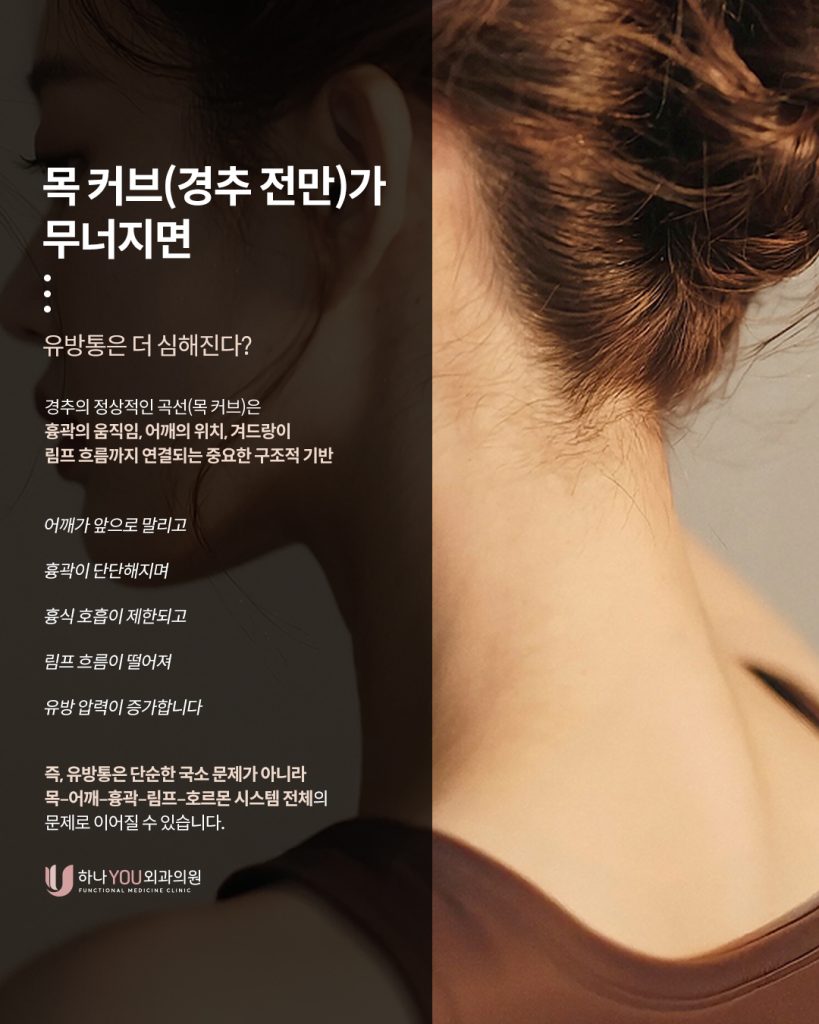 흔히 부산유방통을 설명할 때 유방과 겨드랑이만 생각하기 쉽지만, 실제로는 목 커브(경추 전만)가 중요한 역할을 합니다.