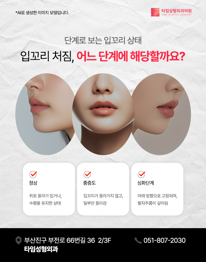 이 단계에서는 웃을 때에는 입꼬리가 올라가지만, 가만히 있을 때에는 약간 처져 보이는 인상이 나타날 수 있습니다. 이러한 변화는 입 주변 근육의 균형이나 탄력변화, 생활습관 등 여러 요인이 복합적으로 작용하면서 나타나는 경우가 많습니다.